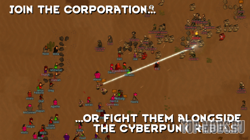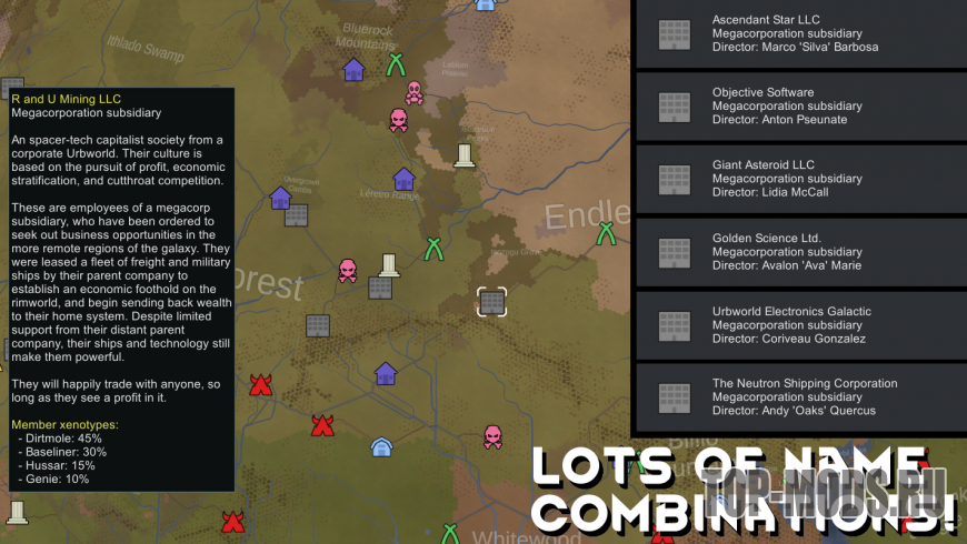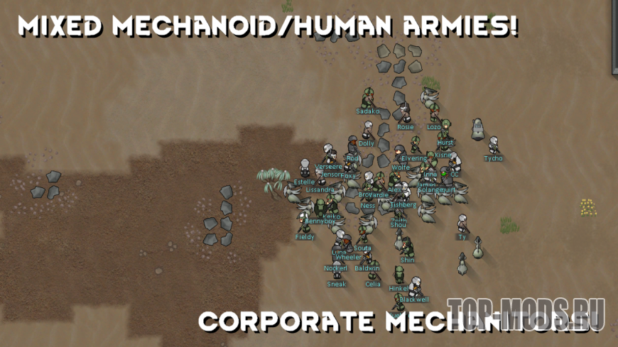 Представляем вам Корпорацию! Это мод фракции, добавляющий корпоративную фракцию в тематике Urbworld. Корпорация имеет доступ к передовым технологиям спейсеров, включая механизаторов, которые они используют для создания боевых мехов вместе со своими бионически дополненными солдатами. Корпорация обычно использует в бою проверенные временем мехи, такие как Scythers, Lancers и Pikemen, а также иногда легионеров для поддержки.
