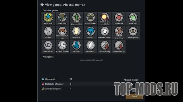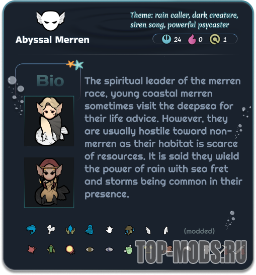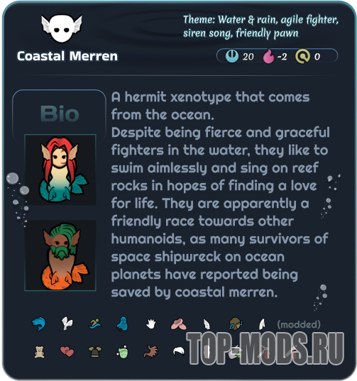 Этот мод добавляет два ксенотипа, вдохновленных мерфолками. Вдохновленные рассказами о русалках и сиренах, эти расы процветают в воде и дожде.
