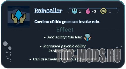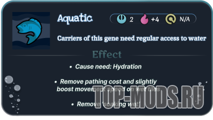 Этот мод добавляет новые гены, которые взаимодействуют с водой, новые способности, связанные с водой или пребыванием в ней, новый тип фокусировки для психастов, милую новую дриаду-кальмара, которая особым образом взаимодействует с водой, и (если установлен VPE:More Plants) новые водные растения.