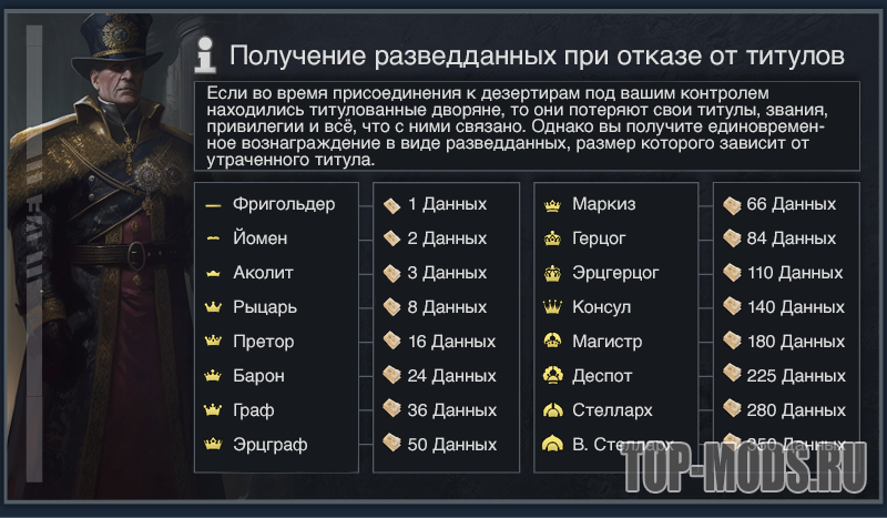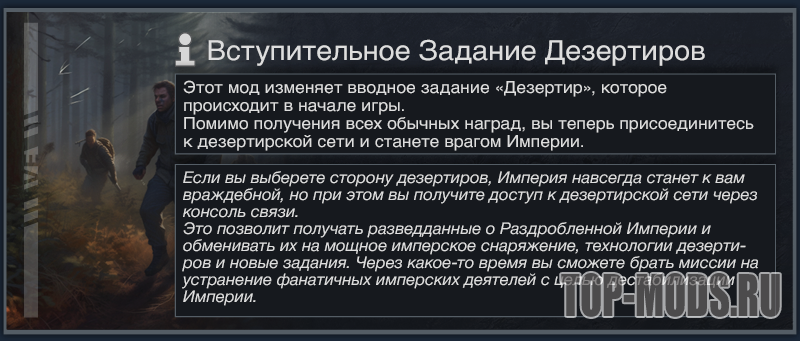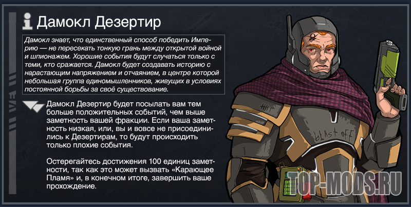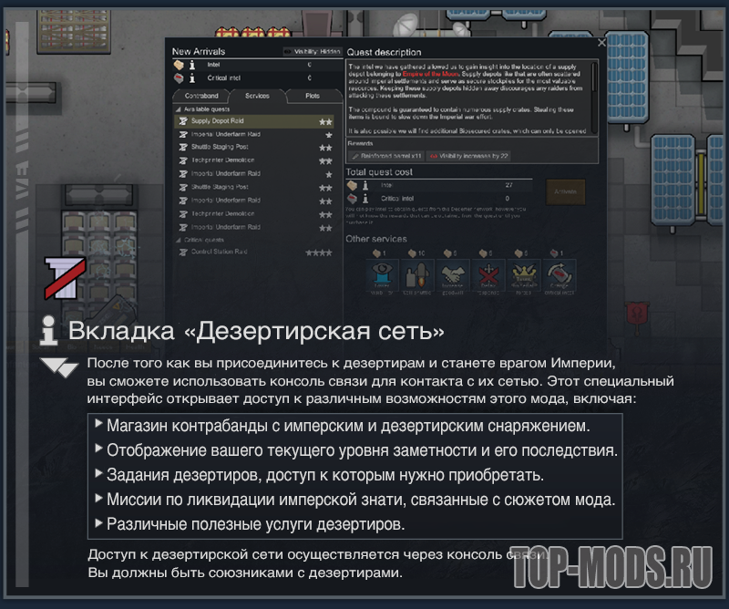 Создавая этот мод, мы хотели дать вам почувствовать себя частью движения сопротивления, сеть которого охватывает всю планету, но при этом держится в тени. Вы сможете связываться с другими ячейками дезертиров, чтобы они присылали за вами челноки, устраивали провокации и отвлекали внимание имперских войск. Всё это вы будете делать, торгуя разведданными - новым ресурсом, получаемым непосредственно от Империи различными способами.