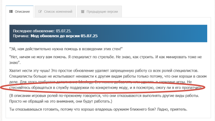 Хватит нести эту чушь! Это простое обновление удаляет запрещенную работу со всех ролей специалистов. Специалисты больше не испытывают ненависти к другим видам работы только потому, что они хороши в своем деле. Для этого требуется дополнение Ideology. Его можно добавлять или удалять в середине игры. Не стесняйтесь обращаться в службу поддержки по конкретному моду, и я посмотрю, смогу ли я его пропатчить.