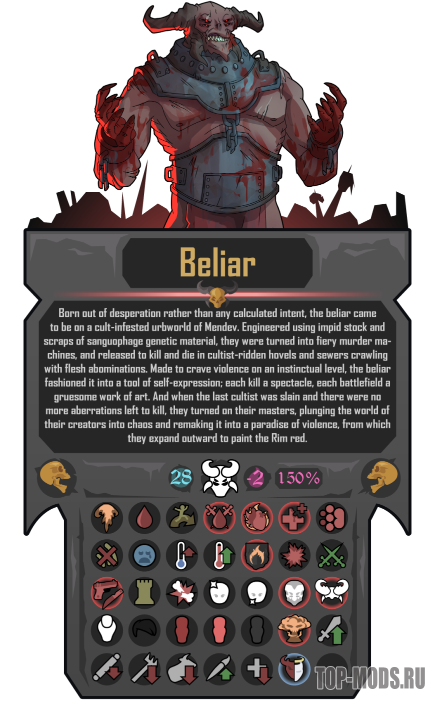 Этот мод добавляет Белиара, гемогенный ксенотип, который живет, чтобы убивать, и убивает, чтобы жить. Наслаждайтесь изысканной резней и раскрасьте Обод в красный цвет вместе со своим адским хозяином, или сражайтесь с демоническими армиями и отправьте их обратно в ад, который их породил.
