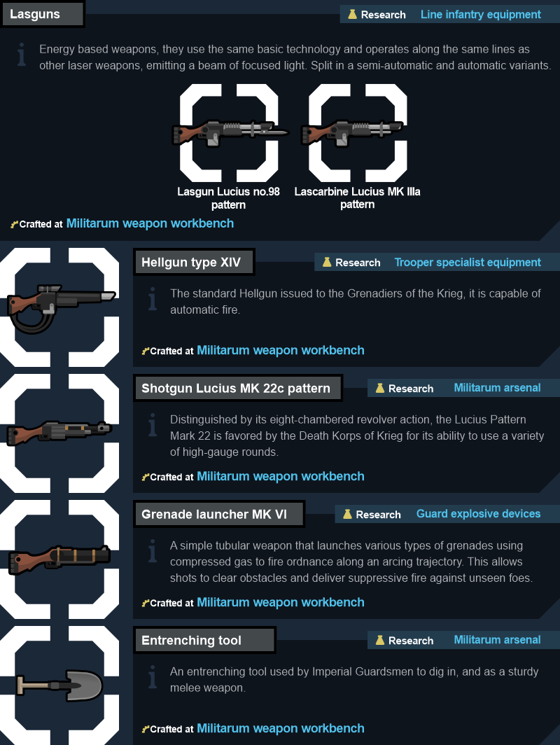 Для разблокировки оружия Крига требуются соответствующие исследования, а также исследования, перечисленные ниже. Для разблокировки оружия могут дополнительно потребоваться соответствующие исследования "оружейных технологий".