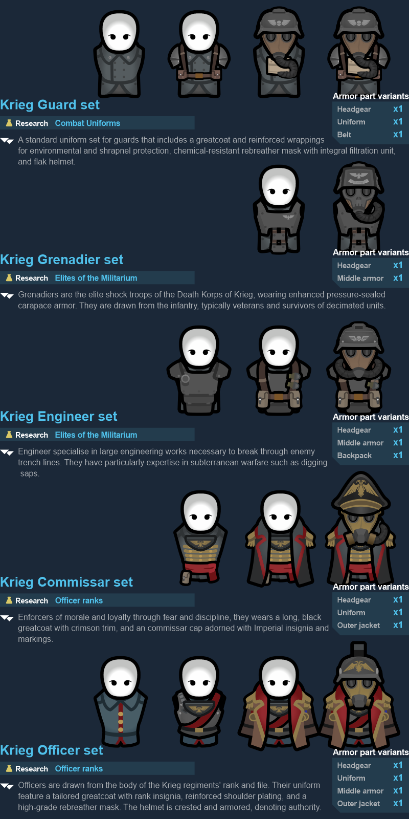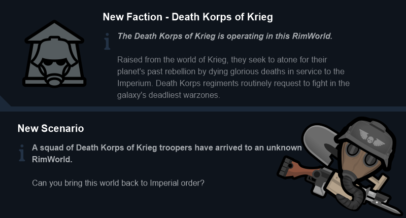 Это наш специальный модуль Корпуса смерти Крига для "GrimWorld 40,000" серий модов, входящая в нашу подсерию "Прославленные полки". Эта подсерия посвящена каждому полку на индивидуальном уровне, предоставляя игрокам больше ресурсов для их ролевой игры. Этот мод, как и другие будущие релизы, является частью нашего особого сотрудничества и объединения усилий с Coventech, и он уже давно ждет своего выхода.
