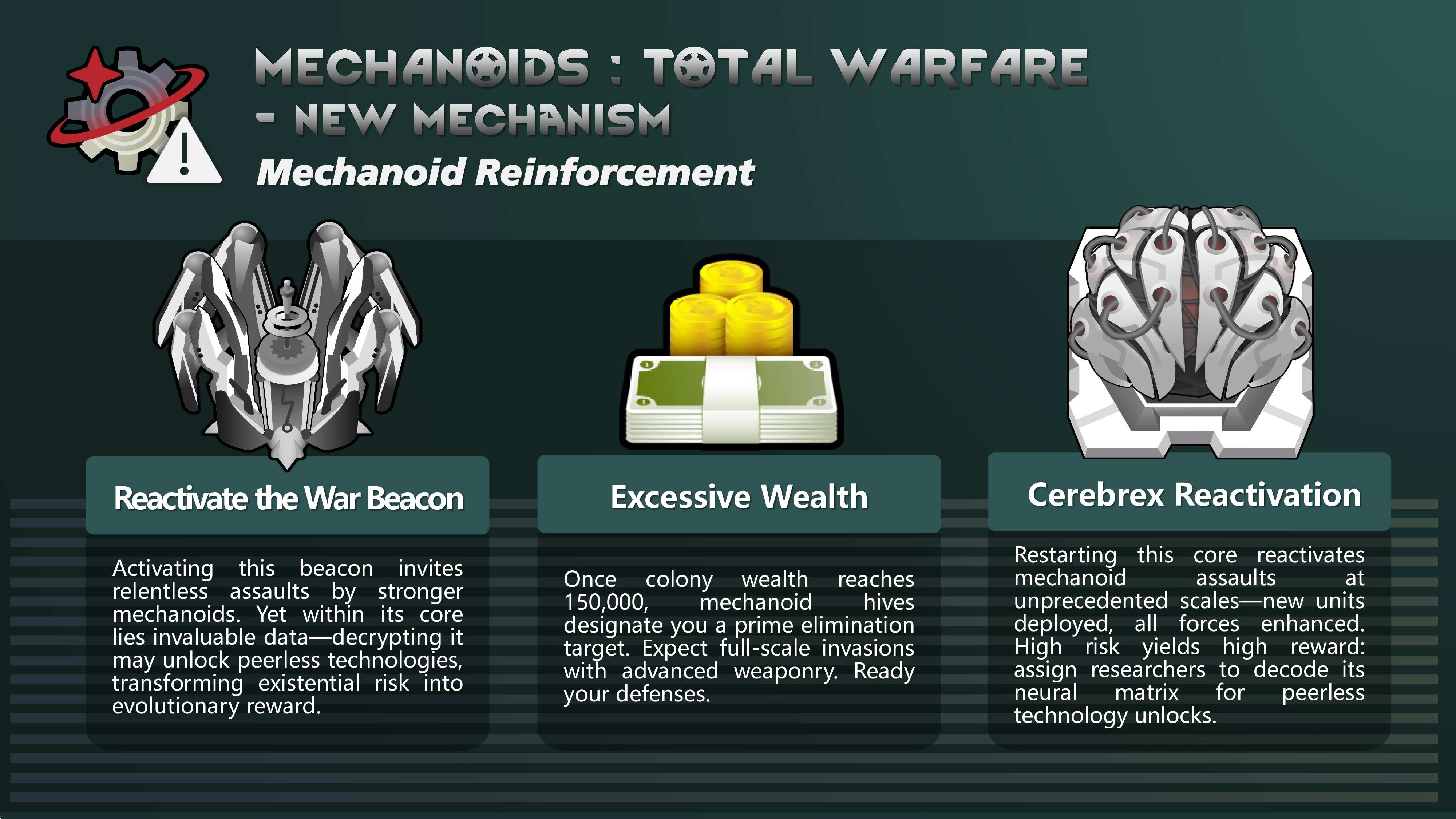 Сложность этого мода в основном заключается в новых механических врагах и сопутствующих им системах улучшений. Эти улучшения постепенно разблокируются, когда игроки вызывают определенные условия во время игры, обеспечивая чрезвычайно хардкорное испытание, но при этом избегая излишнего нагнетания силы. Если вы чувствуете чрезмерное давление во время игры, пожалуйста, определите приоритеты своего опыта - вы можете уменьшить интенсивность рейда или отключить улучшения механоидов в настройках.