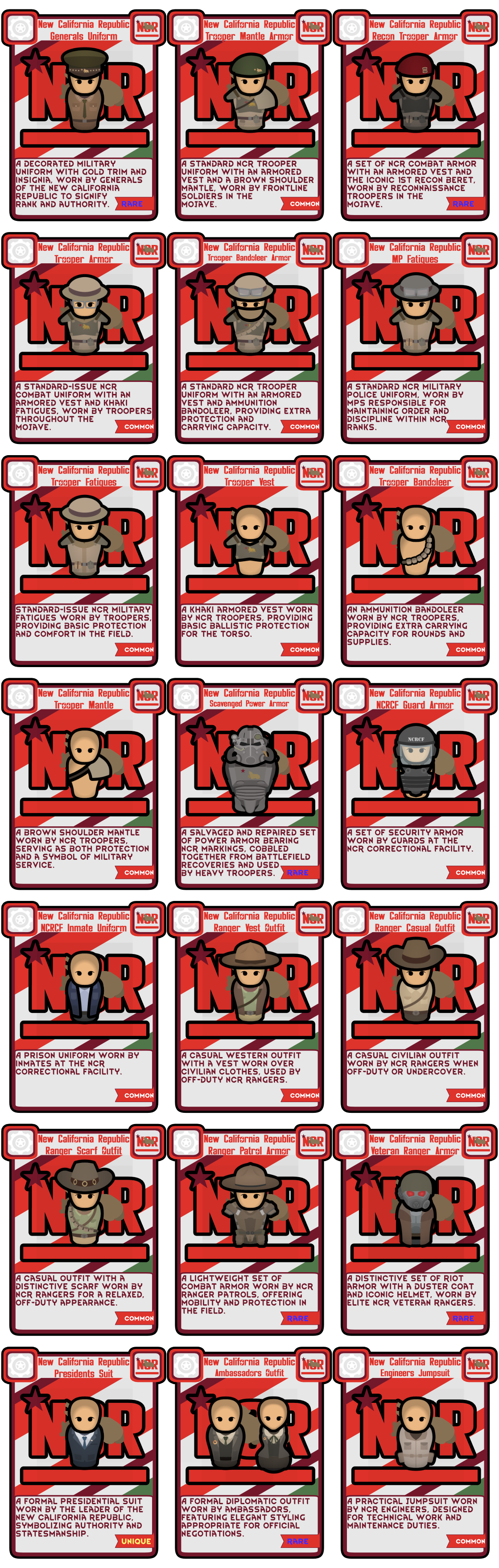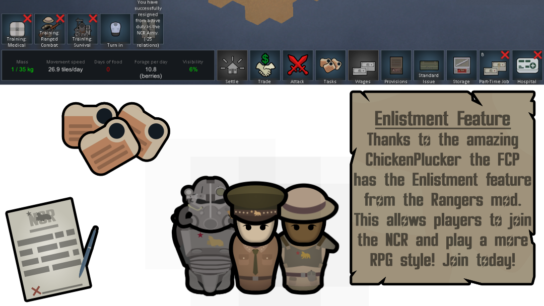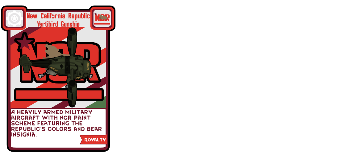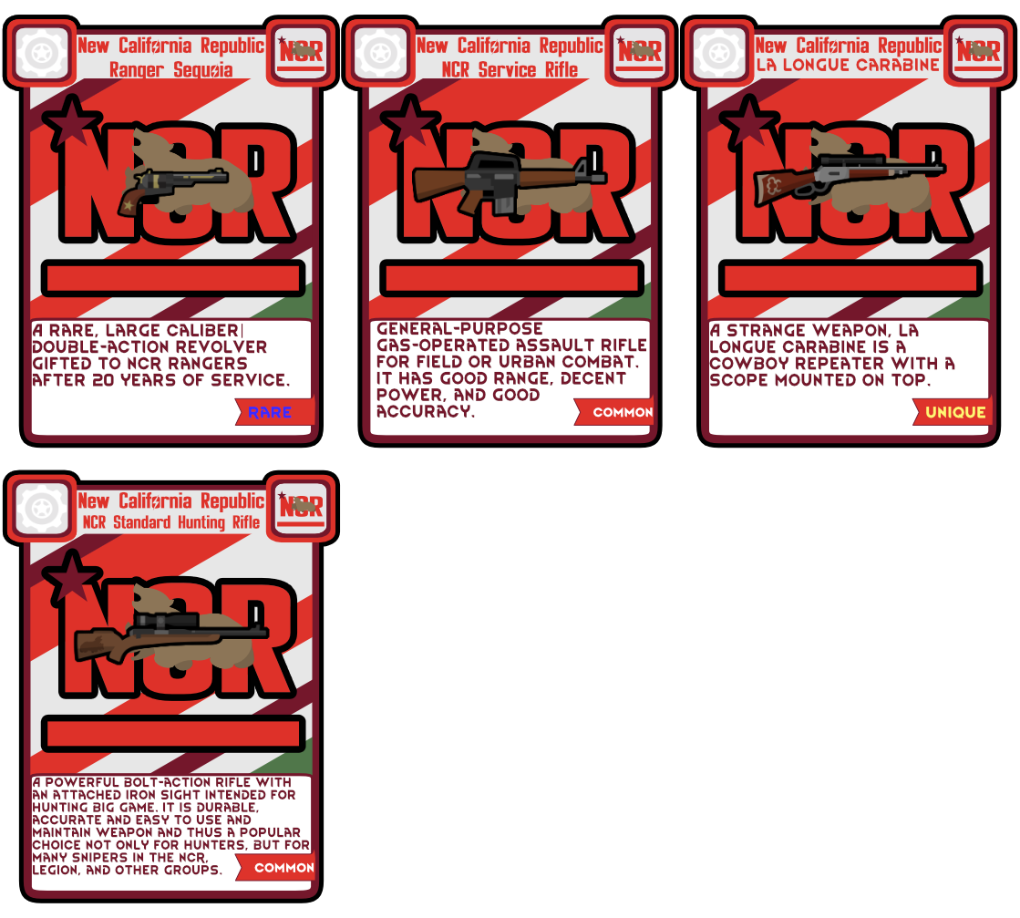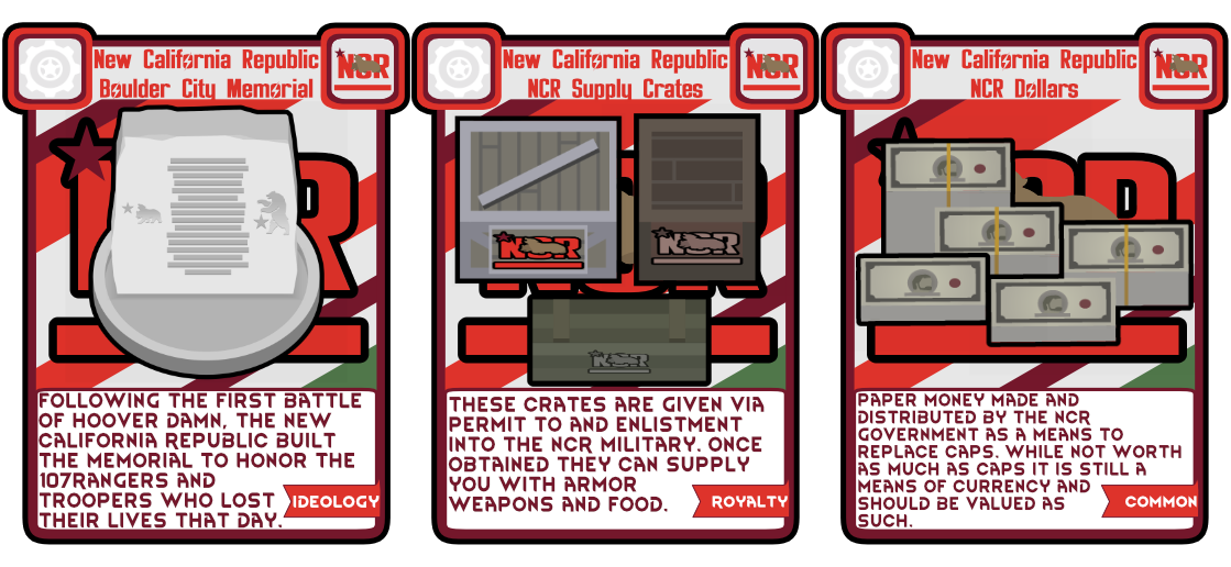 Это мод добавляет фракцию NCR, оружие и одежду. В этом моде представлены все наряды, которые носит Республика Новая Калифорния, сотни пользовательских предысторий, пользовательские закладные, пользовательские идеи и мемы, пользовательская валюта, основанная на фракции NCR, и пользовательский сценарий. Это также добавляет в игру каждого именованного персонажа из игр, который находится в NCR, а также систему наследования в случае смерти лидера. Например, если Кимбалл умрет, следующим лидером станет Ген Оливер и т.д. и т.п.