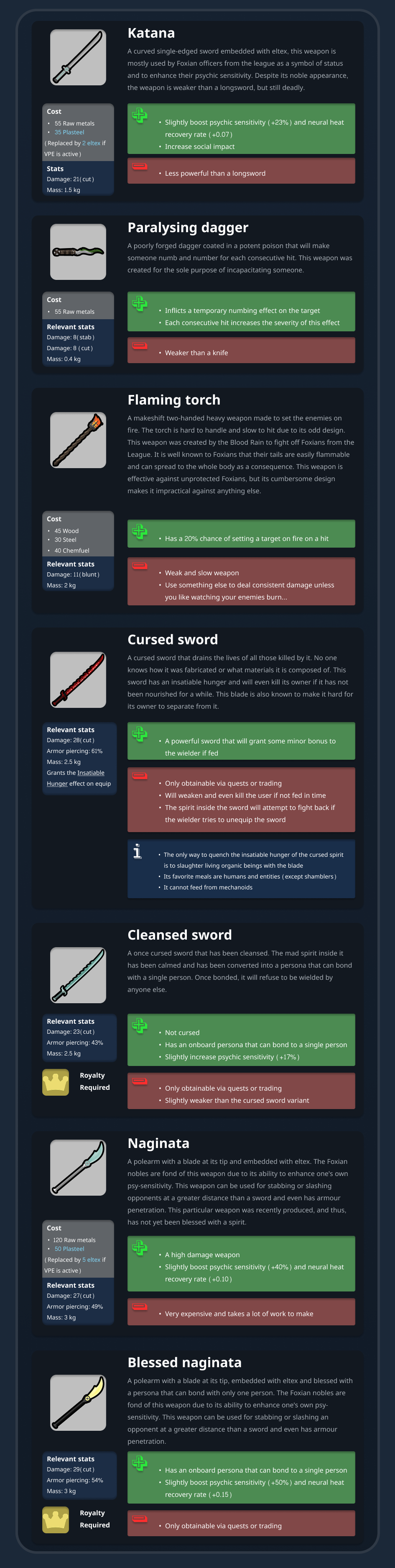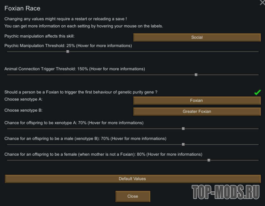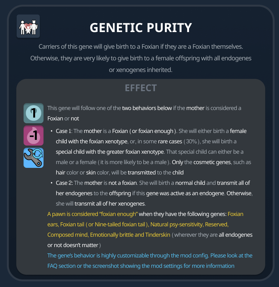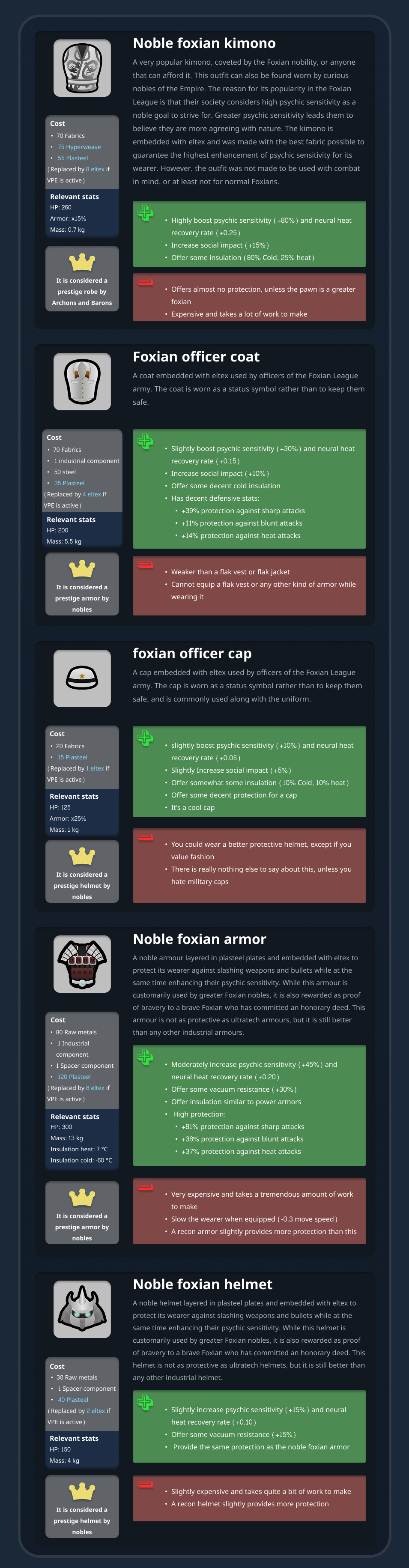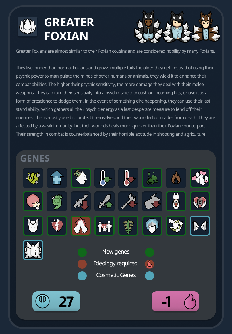Этот мод добавляет ксенотипы Фоксиан и Великих Фоксиан, расу людей-лис, уникальную для определенного мира на краю галактики (того, в который вы только что врезались). Они специализируются на направлении своей психической чувствительности на укрепление физической силы или манипулирование другими людьми с помощью психических способностей.