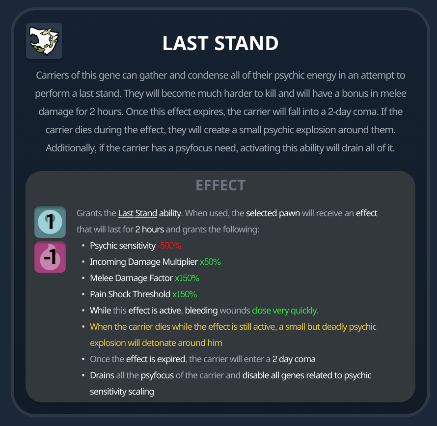 Кроме того, этот мод добавляет 20 новых генов, 7 новых видов оружия (2 из них заблокированы за DLC Royalty), 3 новых вида брони, 2 головных убора, 3 новых аксессуара, 2 новые фракции, 7 различных книг, в основном с информацией об этих новых фракциях, и новый стартовый сценарий.
