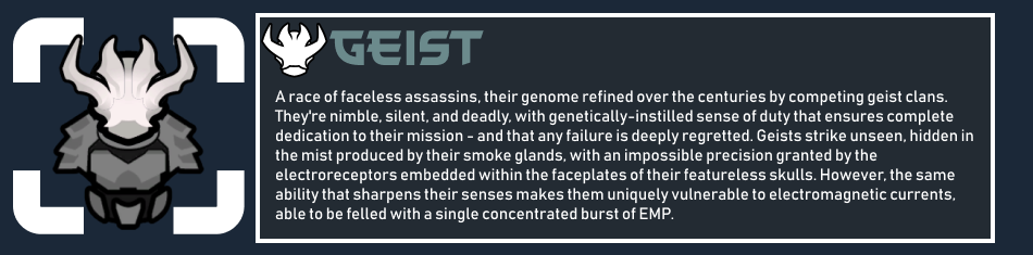 Раса безликих убийц, чей геном веками оттачивался конкурирующими кланами Призраков. Они проворны, бесшумны и смертоносны, с генетически привитым чувством долга, гарантирующим полную преданность миссии - и глубокое сожаление о любой неудаче. Призраки наносят удар незримо, скрываясь в дыму, производимом их дымовыми железами, с невозможной точностью, обеспеченной электрорецепторами, встроенными в пластины их безликих черепов. Однако та самая способность, что обостряет их чувства, делает их уникально уязвимыми к электромагнитным импульсам - их может свалить всего один концентрированный выброс ЭМИ.