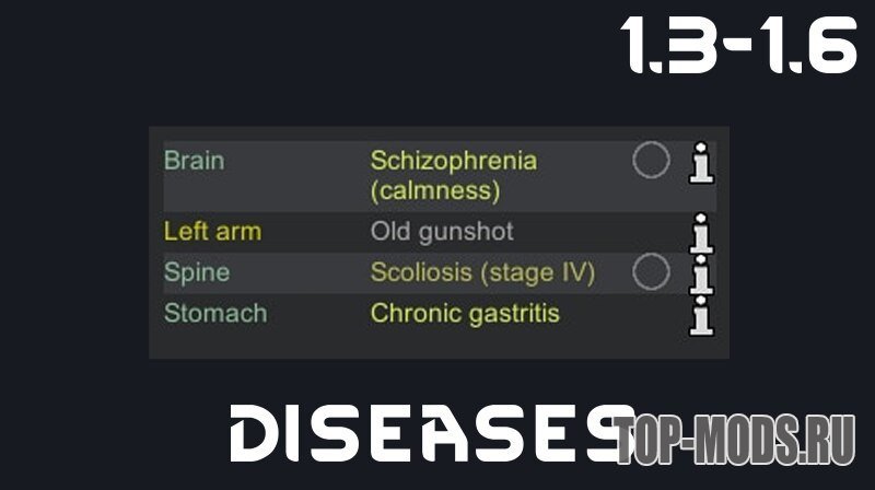 Мод добавит в вашу игру около 50 болезней и хронических состояний, которые существенно разнообразят ваш геймплей. Одни болезни могут порождать другие.
