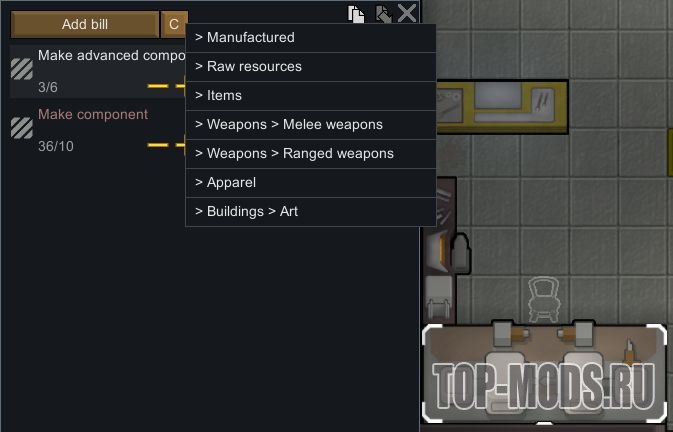 Мод Categorized Crafting Bills добавляет небольшую кнопку на каждую вкладку рабочего места, которая представляет доступные предметы в серии подменю, поэтому вам не нужно искать ее во всем списке.