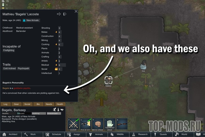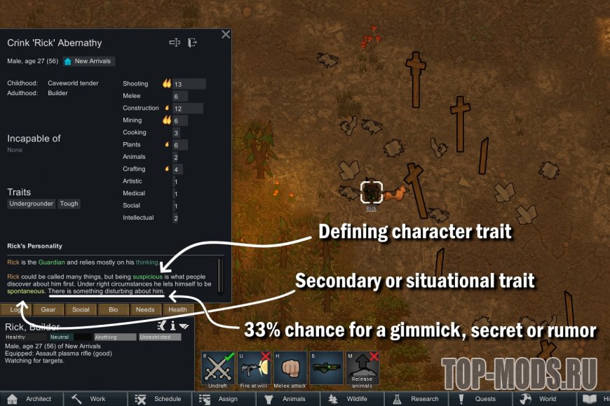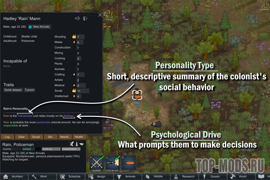 Мод делает каждого колониста уникальным существом: мыслящим, говорящим и ведущим себя по-разному, в зависимости от того, кто они и с кем они взаимодействуют. Этот мод разработан как гораздо более совместимый, менее инвазивный преемник Psychology с использованием игровых файлов, добавляя при этом новую игровую механику и процесс принятия решений.