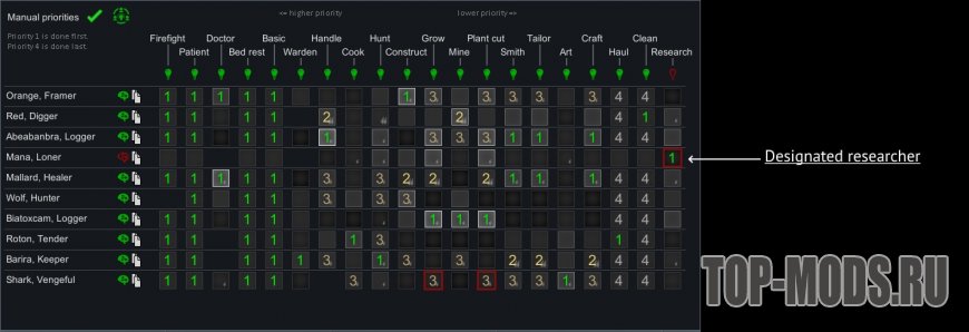 Этот мод автоматически назначает приоритет работы вашим пешкам X раз за игровой день (регулируется настройкой «Частота обновления»). Безопасное значение по умолчанию - 24 (один раз в час), но рекомендуется установить 72 или выше, чтобы мод лучше реагировал на внутриигровые события.