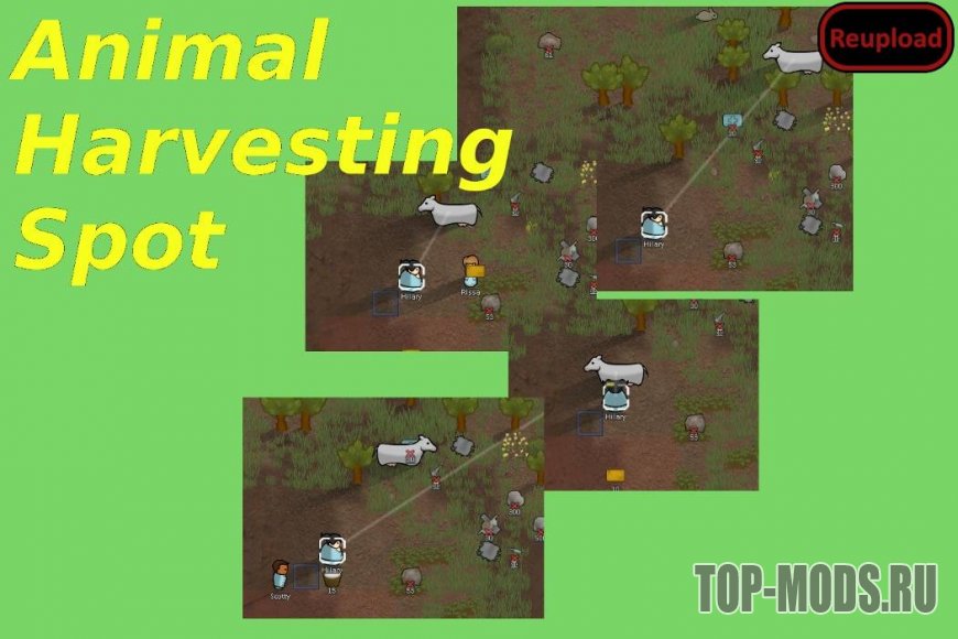 Этот мод добавляет место сбора животных. Колонист попытается пойти на место сбора животных, позовите животных, затем собирайте урожай.