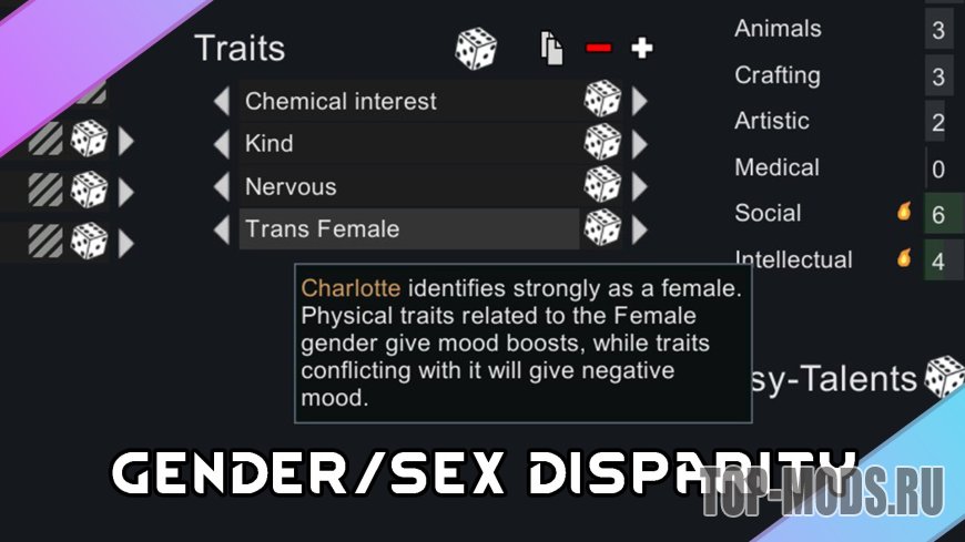 Конкретные предметы, hediff'ы и черты характера увеличивают общее количество женских и мужских качеств пешки, которое затем рассчитывается как общая дисфория на основе их идентификации.