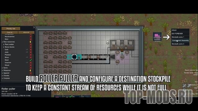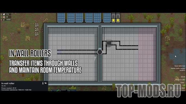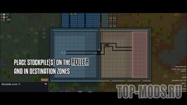 Мод industrial Rollers для Rimworld — добавляет в игру конвейеры. С помощью конвейеров можно перемещать предметы по карте. Для работы мода не требуется начинать новую игру.