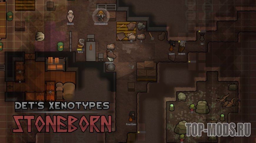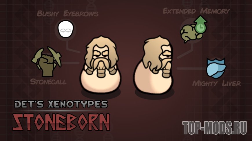 Этот мод вводит в список новый ксенотип, известный как Каменнорожденные, низкорослые и выносливые, они роют свои дома в горах и являются чрезвычайно талантливыми инженерами и ремесленниками.