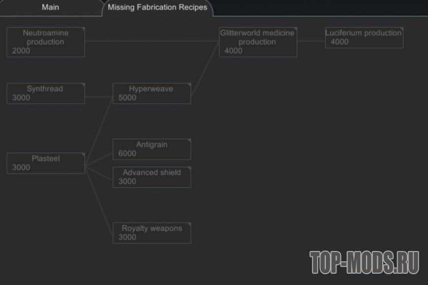 Этот мод добавляет новые рецепты для непроизводимых предметов из мастерской и лаборатории по изготовлению лекарств, рецепты разблокируются через новые исследования.