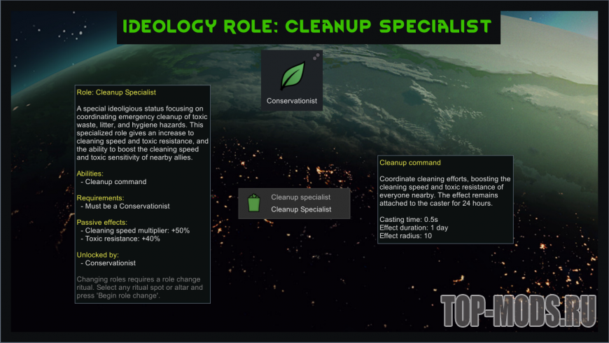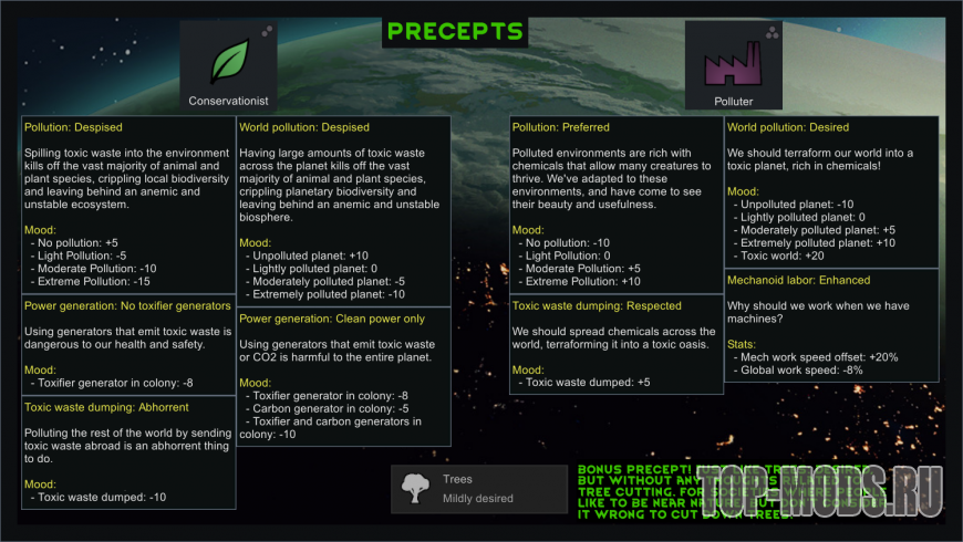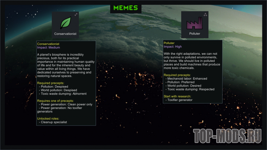 Этот мод добавляет два новых мема в серию модов Mort's Ideologies, сосредоточенных вокруг механики загрязнения Biotech: Conservationist и Polluter!
