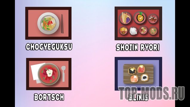 Этот мод является лишь самостоятельной частью моего более крупного проекта "Geopolitical Rimworld". Если я добавлю новые фракции в этот мод, с новыми традиционными блюдами, я могу добавить их и сюда.