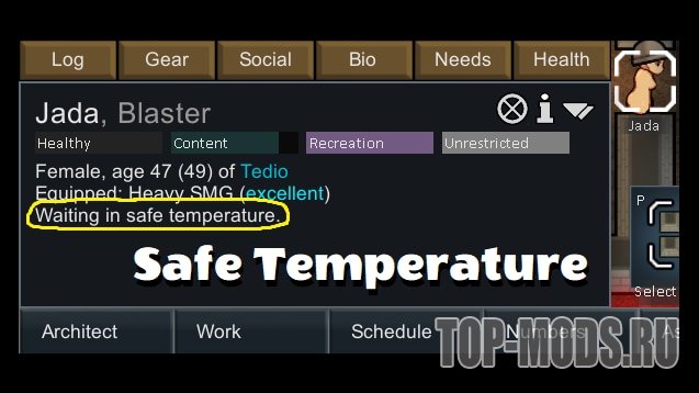 Улучшает механику безопасной температуры, заставляя пешек немедленно бросать то, что они делают, при достижении серьезной температуры и отправляться ждать в безопасную температурную зону. Также заставляет их оставаться в зоне безопасной температуры до тех пор, пока они не перестанут дрожать/не получат первоначальный тепловой удар.
