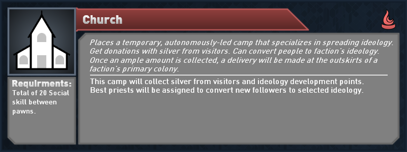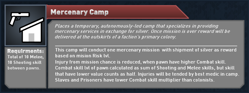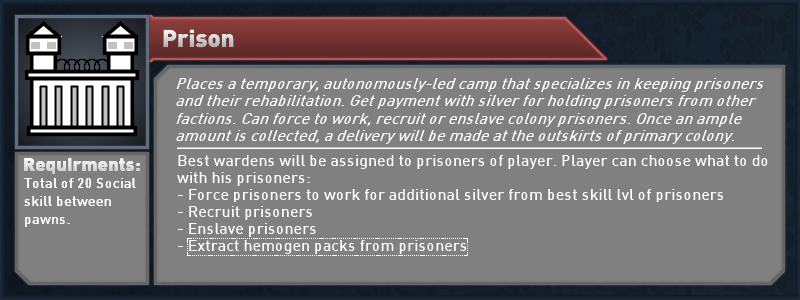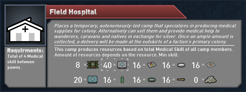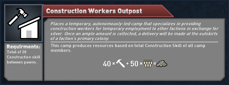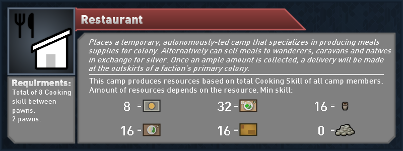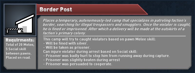 Мод добавляет несколько новых типов форпостов в дополнение к Vanilla Outposts Expanded. Новые форпосты должны помочь вашим пешкам с высокими навыками строительства/медицины/кулинарии/искусства найти свой форпост, где они будут наиболее полезны.