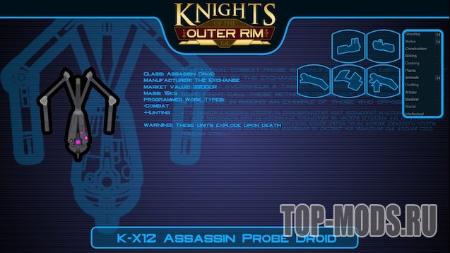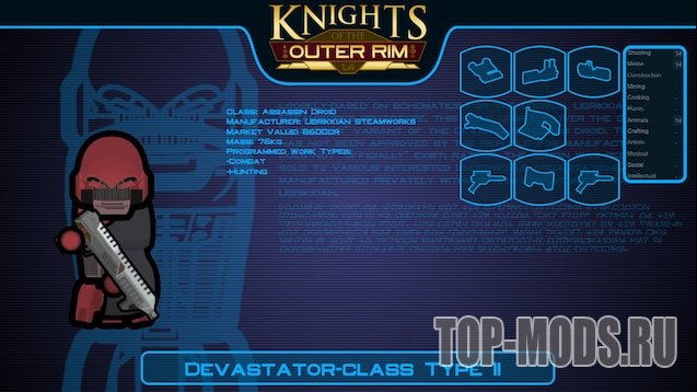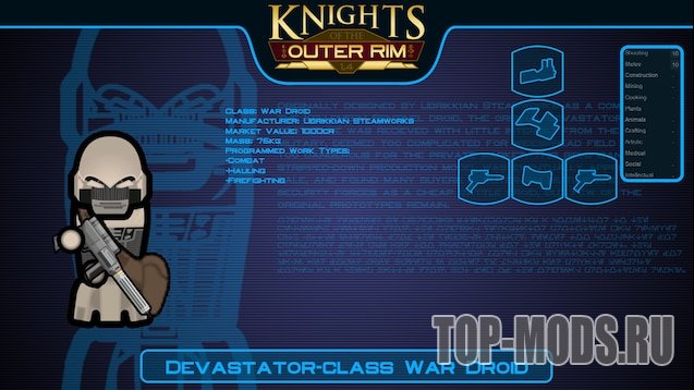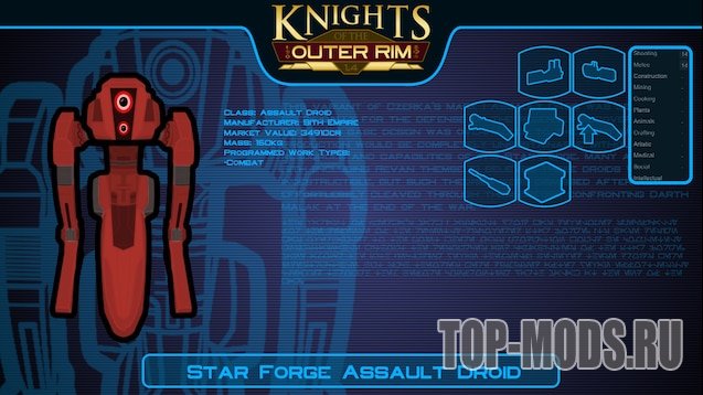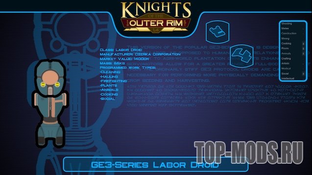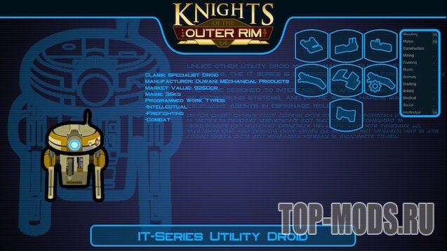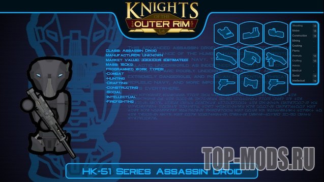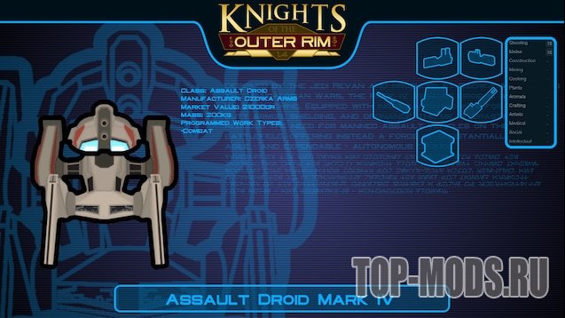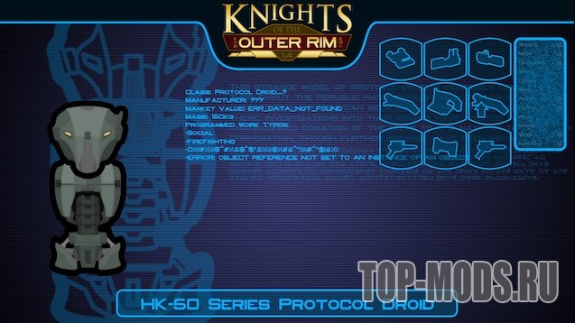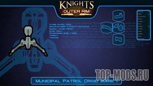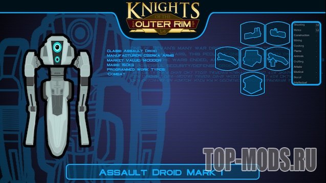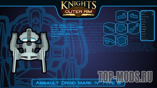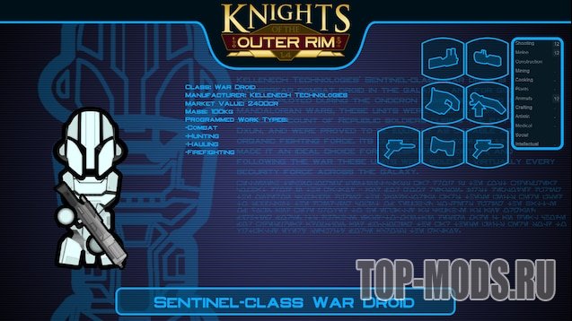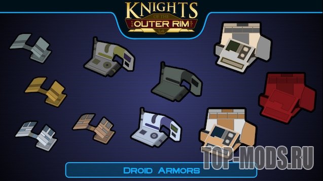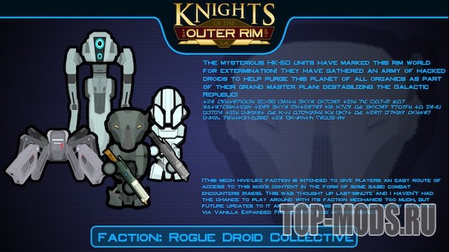 Добавляет 22 типа дроидов из Star Wars: Knights of the Old Republic и Star Wars: Knights of the Old Republic II - The Sith Lords, а также фракцию мехов, похожую на улей, и широкий выбор специфического для дроидов оборудования. Эти дроиды используют фреймворк Mechanical Humanlikes.