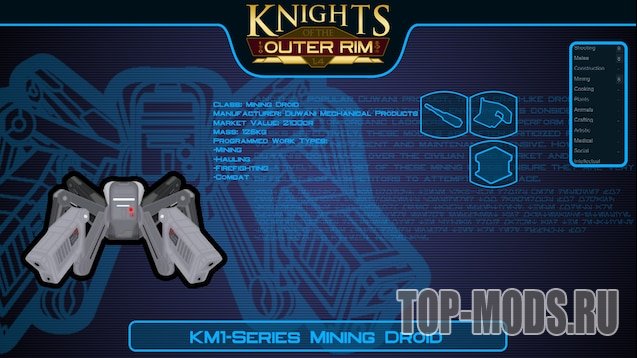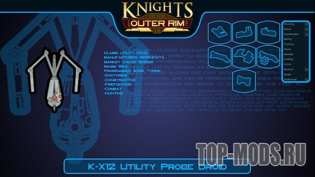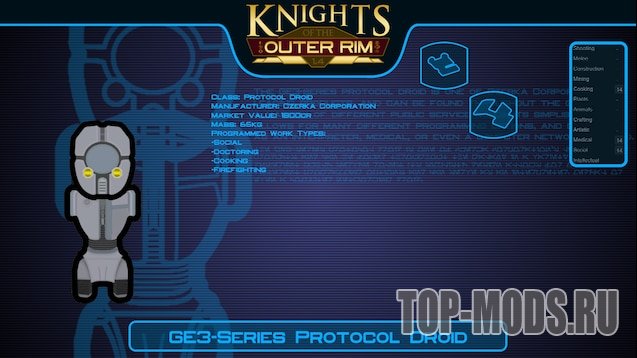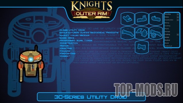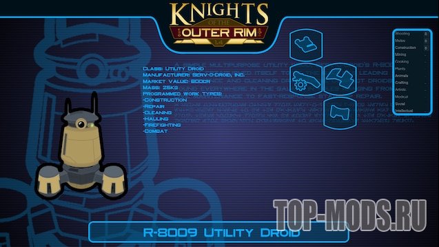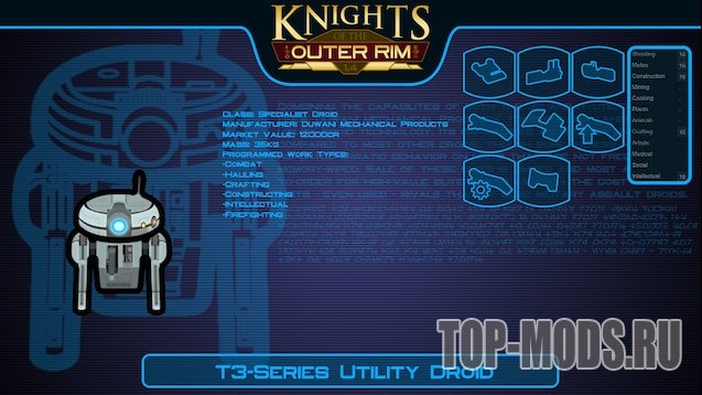 ИССЛЕДОВАНИЯ: (возможно, вам придется прокрутить страницу вниз, она находится на главной вкладке исследований) Для этого мода я добавил серию исследовательских проектов, чтобы разблокировать рецепты ремесел для большинства типов дроидов, предлагаемых этим модом. Для исследования дроидов высшего уровня требуются техпринты. Набивная броня дроидов также может быть исследована и изготовлена после завершения первого проекта по исследованию дроидов. По мере работы над модом KotOR Core components будет проведена более масштабная модернизация ремесла/исследований для всех модов проекта!