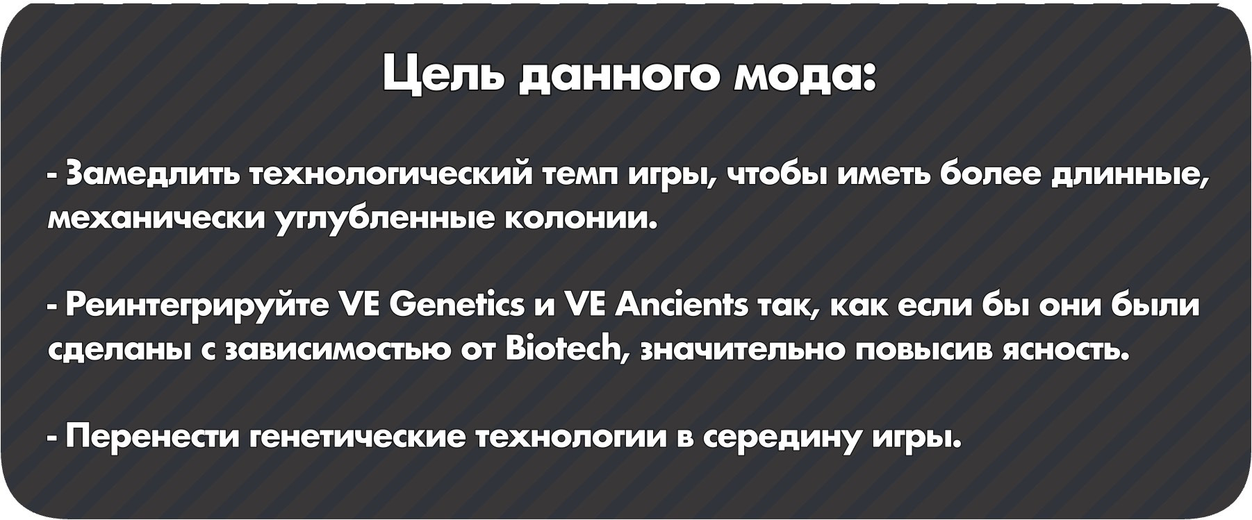 Данная модификация замедляет технологический темп игры, чтобы иметь более длинные, механически углубленные колонии.