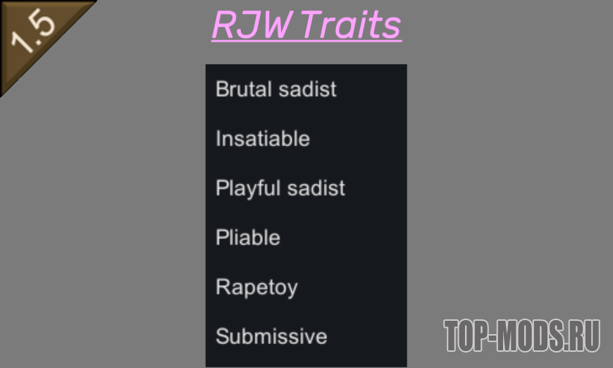 Дополнение для популярного 18+ мода RimJobWorld. Здесь присутствуют черты, характерные для RJW! Садисты, по-настоящему ненасытные, покорные и податливые, теперь в вашем распоряжении!