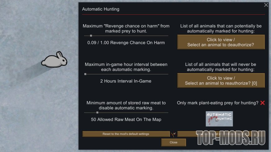 Автоматическая охота автоматически отмечает потенциальных животных для охоты и даст вашим охотникам задание поохотиться если на складе недостаточно мяса!