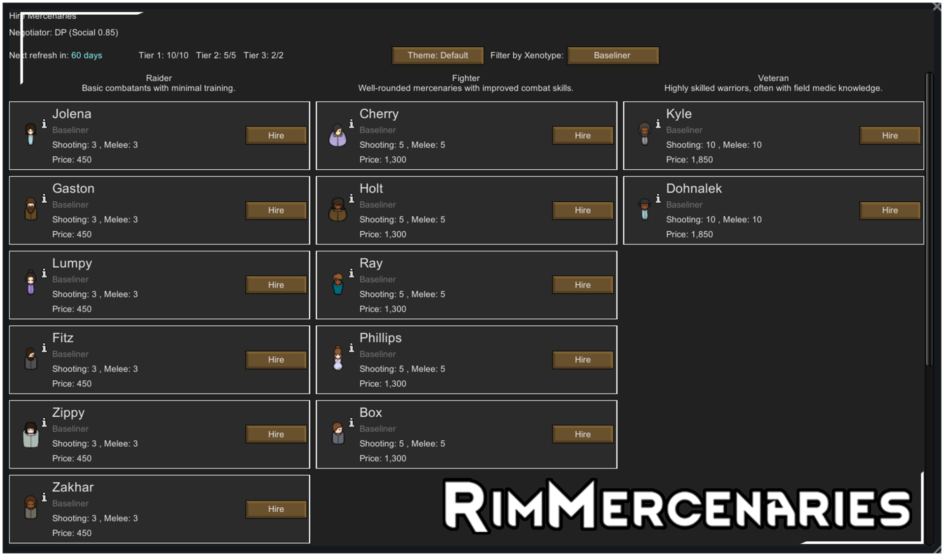 Мод имеет удобный интерфейс, изменения стиля, просмотр навыков персонажа перед покупкой, а также расстрельный список ваших бойцов, от самых слабых рейдеров до профессиональных бойцов с навыками полевого медика.