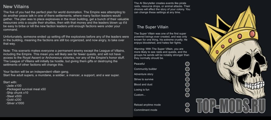Superhero Genes — Организация героев добавляет незлобные суперфракции, а для тех, у кого есть королевская кровь, добавляет несколько заданий, в том числе одно-два задания в конце игры. Для этого требуется данный мод, и многие задания Организации героев связаны с Лигой злодеев.