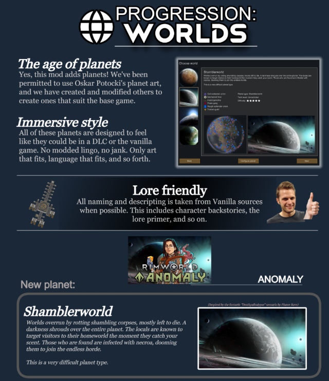 Исследуйте другие планеты из вселенной Rimworld. Начните с мира шамблеров в разгар непрекращающегося зомби-апокалипсиса, средневекового мира, ограниченного доиндустриальной эпохой, и ретекстурированной Земли с текстурами от Оскара Потоцкого.