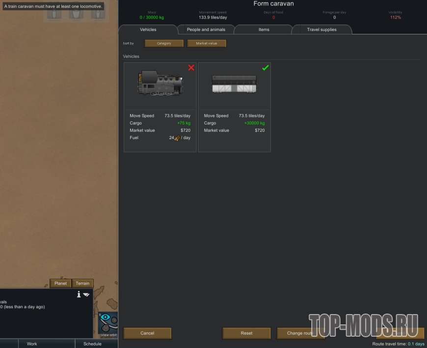 Чтобы сформировать железнодорожный состав, просто перейдите на карту мира и сформируйте его, как обычно. Все доступные железнодорожные транспортные средства будут перечислены на вкладке "Транспортные средства" на экране формирования состава. Помните, что для того, чтобы выбрать транспортное средство для каравана, на карте мира должна быть изображена железная дорога, построенная на вашей колонии. Во всех железнодорожных караванах также должен быть хотя бы один локомотив.