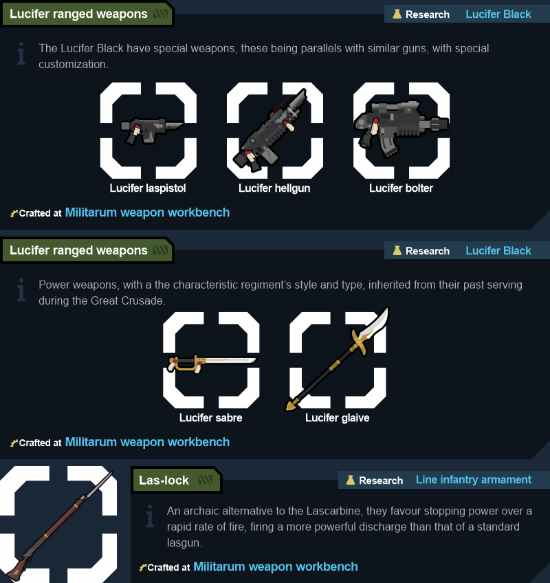 Для разблокировки оружия могут потребоваться соответствующие исследования "оружейных техников", а также исследования, перечисленные ниже.