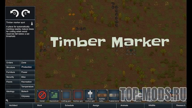 Timber Marker позволяет размещать на карте знаки лесозаготовительной маркировки и настраивать условия, такие как минимальный запас и радиус. При выполнении заданных условий зрелые деревья рядом с маркером будут автоматически помечены для вырубки.