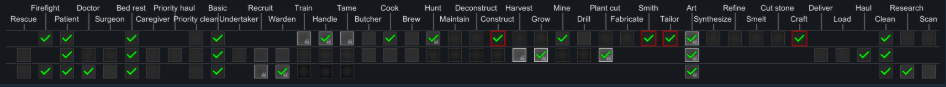 В целом профессии, зависящие от какого-либо навыка, были отделены от профессий, которые используют этот навык, но не зависят от него. Например, сбор урожая и дикорастущих растений сильно зависит от навыка «Растения» у пешки; низкий навык «Растения» может привести к неудачному сбору урожая и потере продукта. Но при посеве культур навык «Растения» у пешки влияет только на скорость работы. Так что, если вы готовите пешку к роли фермера, возможно, вам стоит включить для неё функцию «Вырастить», но только для пешки с самым высоким уровнем навыков.