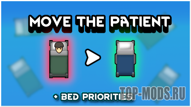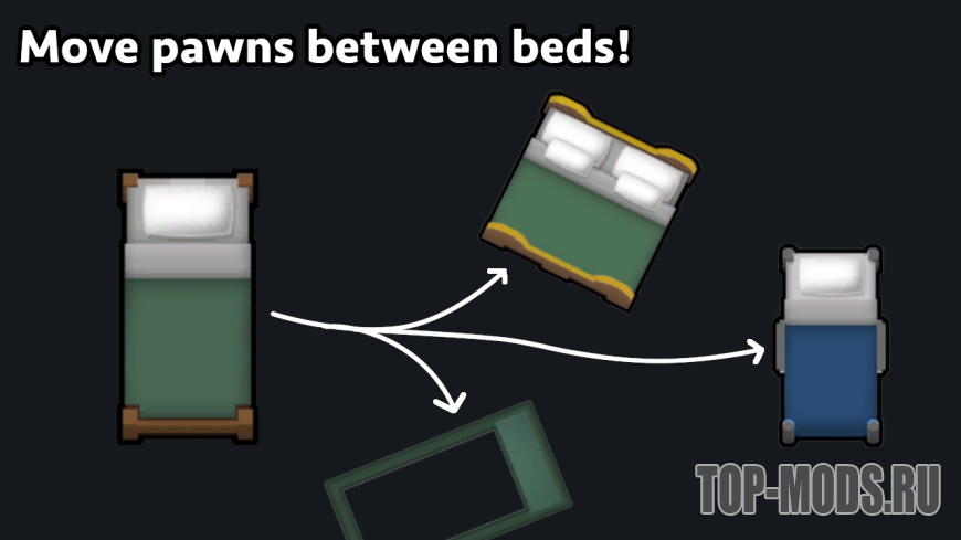 Позволяет перемещать пешки между кроватями, добавляет приоритет медицинским кроватям и назначает кровати для операций. Действует для колонистов, врагов, заключенных, гостей и сбитых пешек.