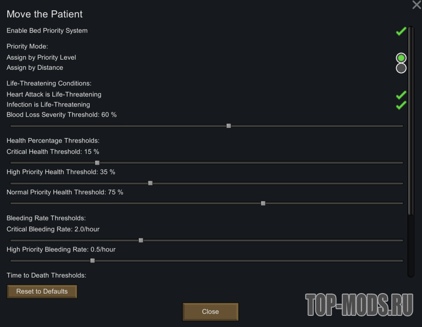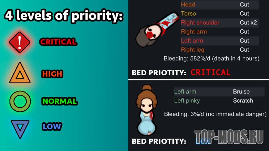 О: Мод рассчитывает степень тяжести пациентов на основе процента здоровья, скорости кровотечения и опасных для жизни состояний, а затем распределяет их по соответствующим приоритетным койкам. Это настраивается в опциях мода.