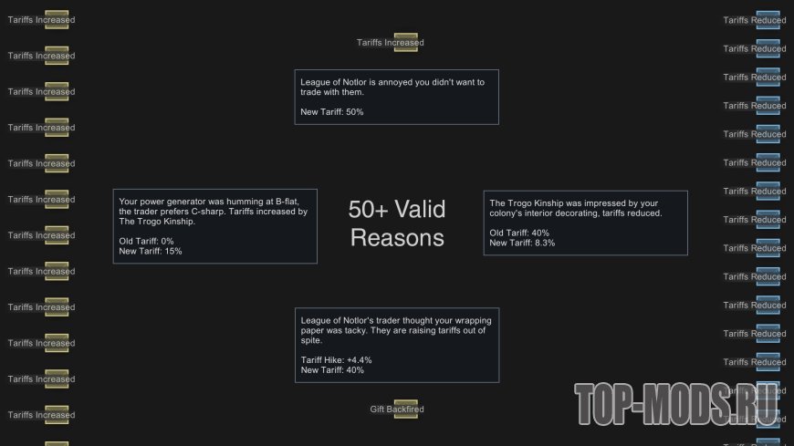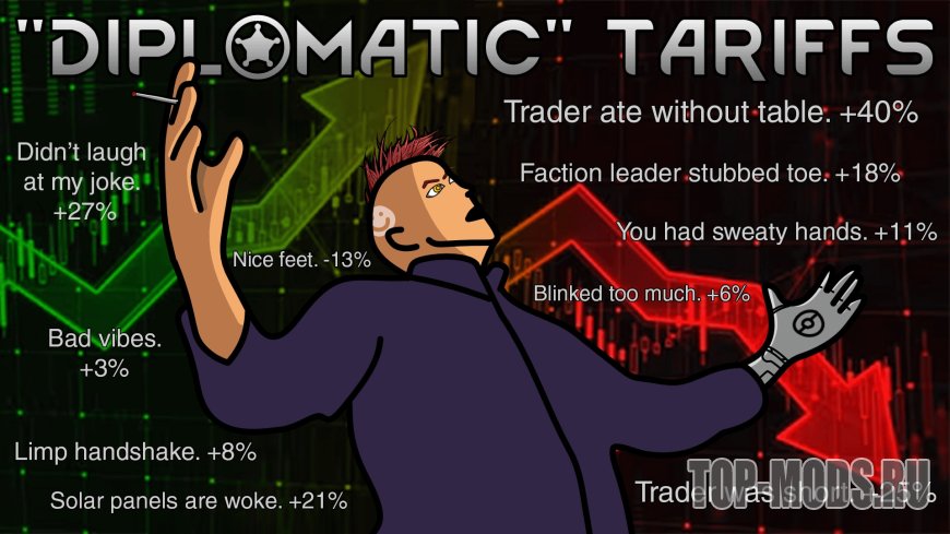 Надоело, что цены зависят только от смазливой мордашки вашего переговорщика? Устали от отсутствия торговых пошлин, основанных на полном рандоме и бреде...кхм, железной логике и здравом смысле? Мод Diplomatic Tariffs - это именно то, что вы искали!