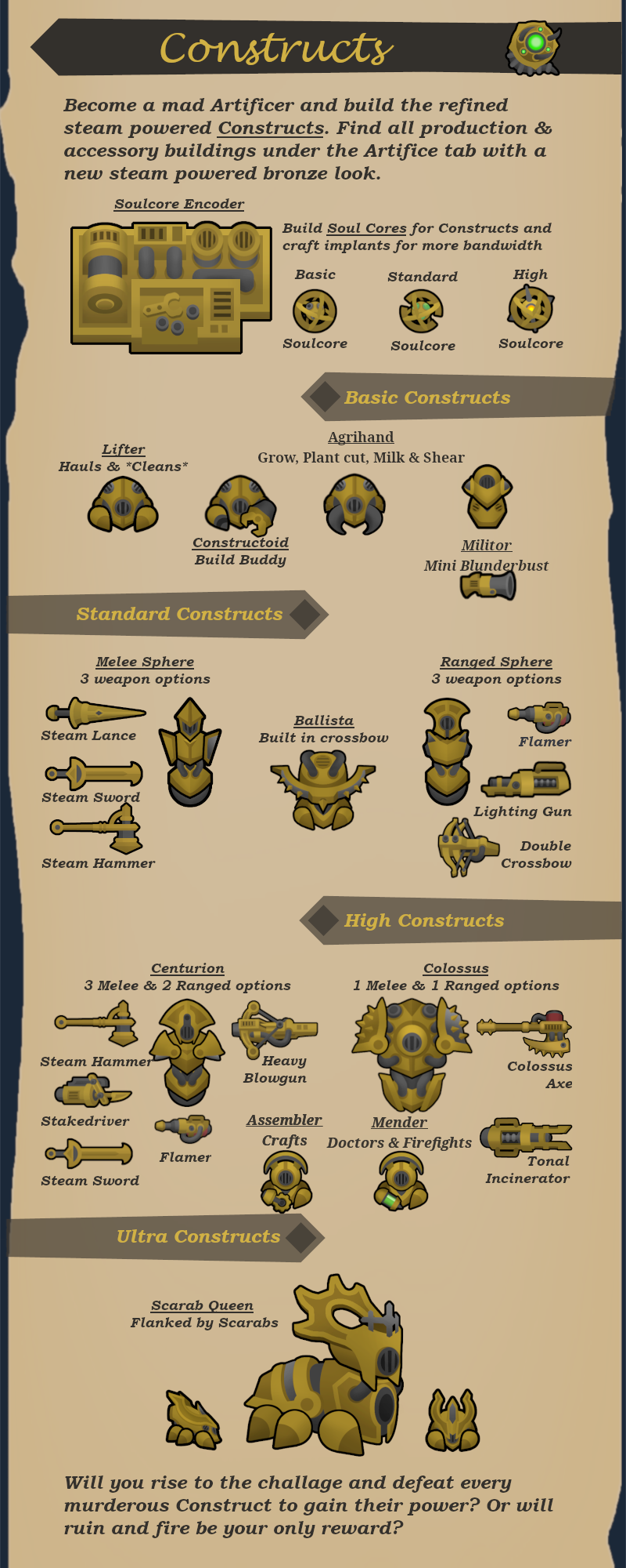 Станьте безумным Артификатором и создайте усовершенствованных паровых Конструктов. Все производственные и вспомогательные постройки находятся во вкладке «Артификаторство» в новом паровом бронзовом стиле.