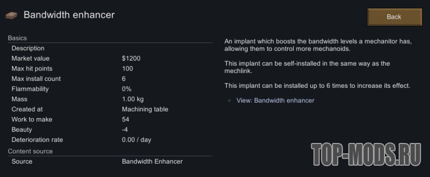 Этот мод добавляет несколько имплантов для механоидов, которые увеличивают максимальное количество механоидов на 5 за каждый уровень, до максимума в 12 имплантов (+60), или, если повезёт, до 20 имплантов (+100)! На мой взгляд, этого увеличения достаточно, чтобы удовлетворить потребности большинства игроков.
