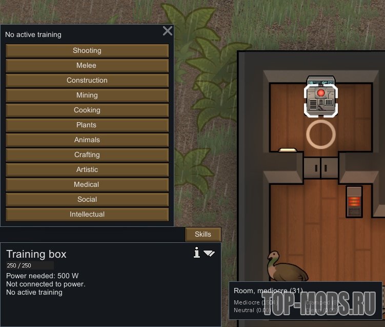 Тренировочный бокс учитывает ежедневное ослабление лимита XP в RimWorld (4000 опыта в день на навык). Если хотите обойти этот лимит, рекомендую использовать Mad Skills вместе с этим модом.