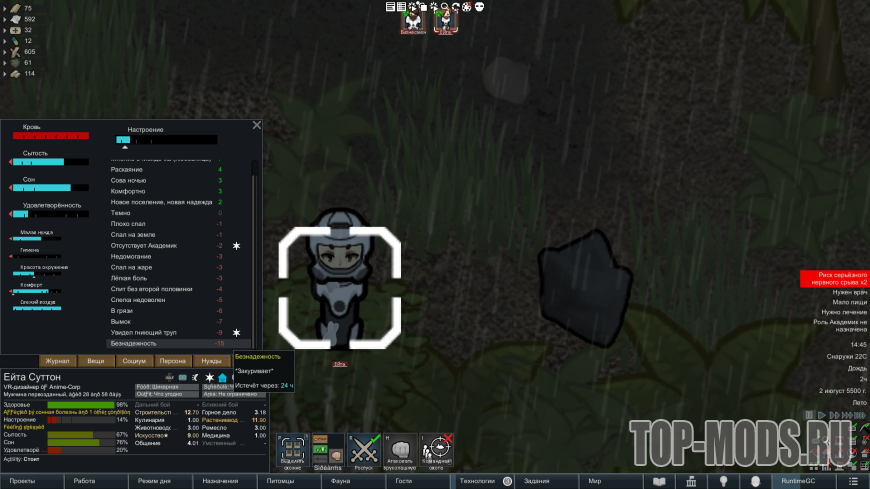 - Некоторые крайне недооценённые в ваниле мысли были значительно усилены. Иногда это предаёт игре элемент психологического триллера, вызывая резкую депрессию у в целом удовлетворённого колониста.