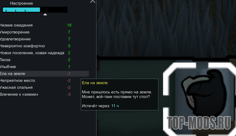 - Если колонисты долго живут в ужасных условиях, они впадают в отчаяние — эффект накапливается до -20, и чтобы вернуть психику в норму, потребуется время.
