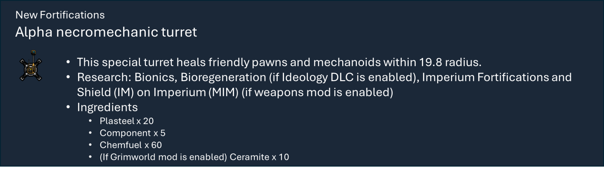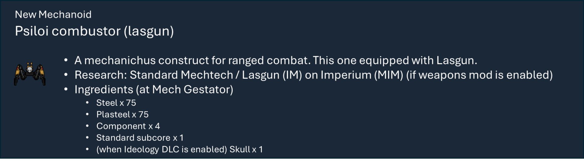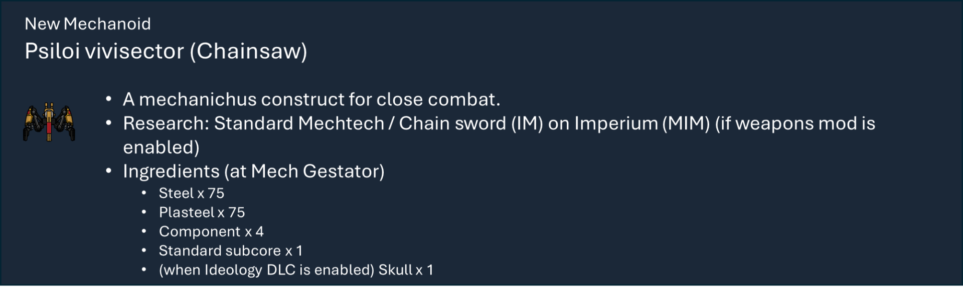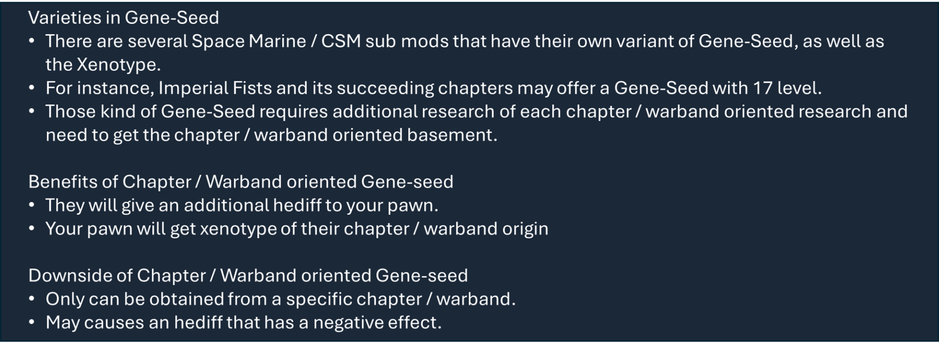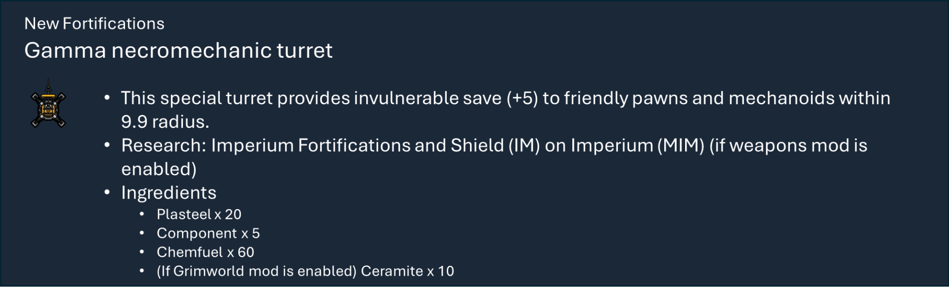 Чтобы правильно использовать мой набор модов, вам необходимо оформить подписку на этот мод, мод на оружие и, по крайней мере, на один из основных модов фракций, а также хотя бы на один из их подфракционных модов. Мод на оружие дает вам 40 тысяч тематических видов оружия с исследованиями и несколькими рабочими местами (только для генокрадов и некронов). Фракция Imperium использует обычный верстак или верстаки из других модов WH, если они включены.), мод Faction core содержит специальные способности и конфигурации для каждой фракции, мод Sub faction предоставляет вам одежду, специальный механизм, фракции NPC и начальный сценарий.