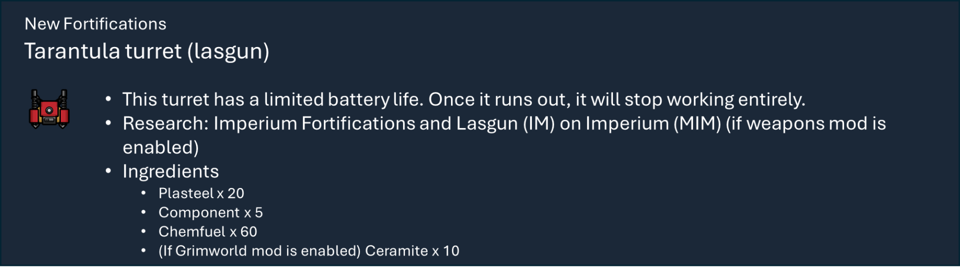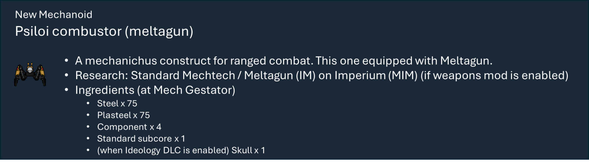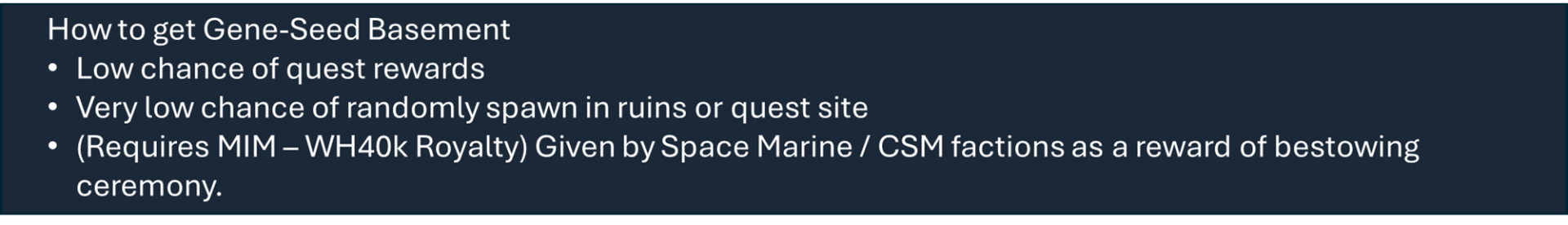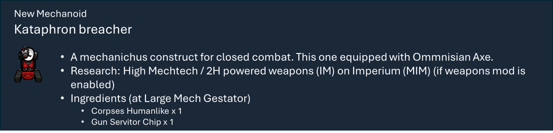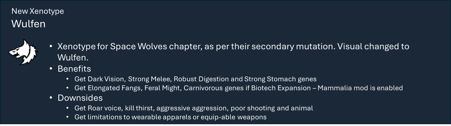 Чтобы правильно использовать мой набор модов, вам необходимо оформить подписку на этот мод, мод на оружие и, по крайней мере, на один из основных модов фракций, а также хотя бы на один из их подфракционных модов. Мод на оружие дает вам 40 тысяч тематических видов оружия с исследованиями и несколькими рабочими местами (только для генокрадов и некронов). Фракция Imperium использует обычный верстак или верстаки из других модов WH, если они включены.), мод Faction core содержит специальные способности и конфигурации для каждой фракции, мод Sub faction предоставляет вам одежду, специальный механизм, фракции NPC и начальный сценарий.