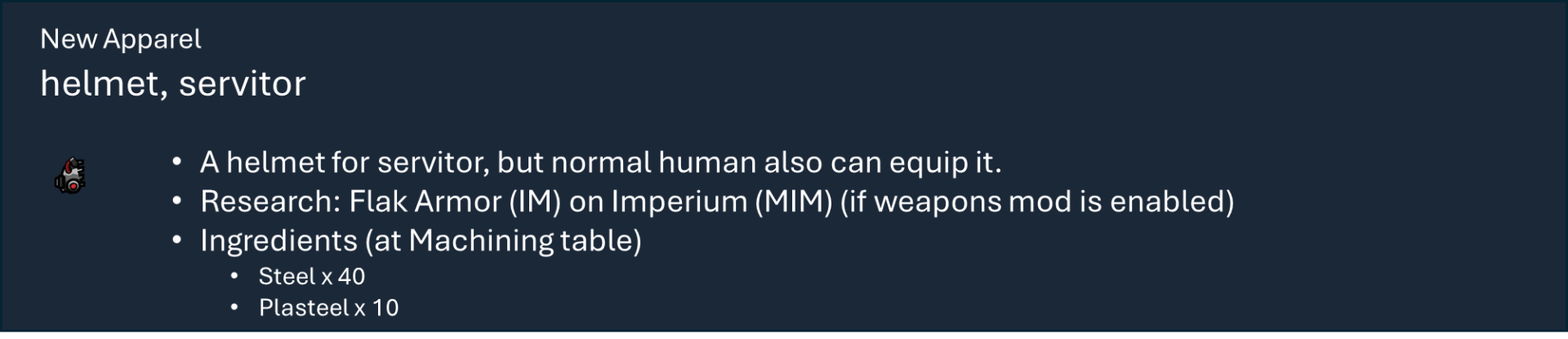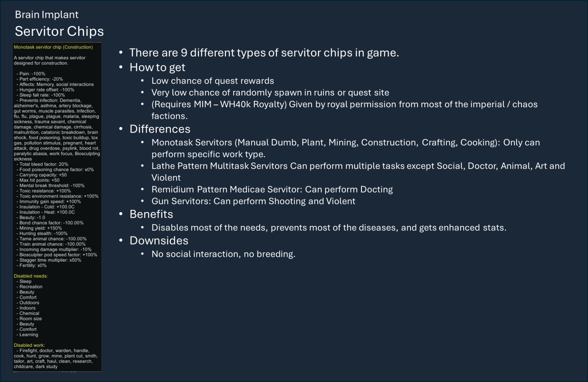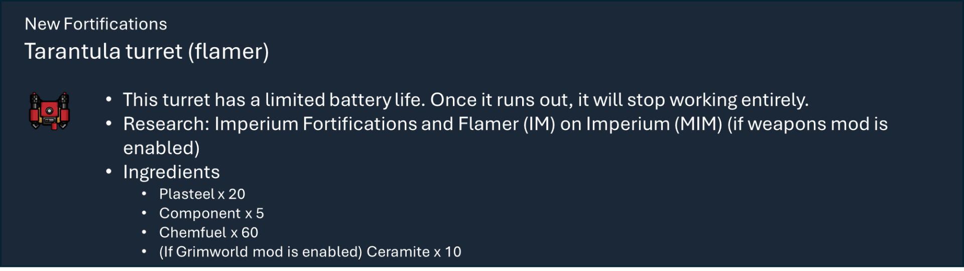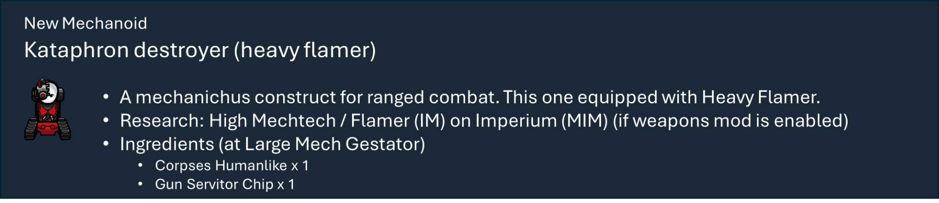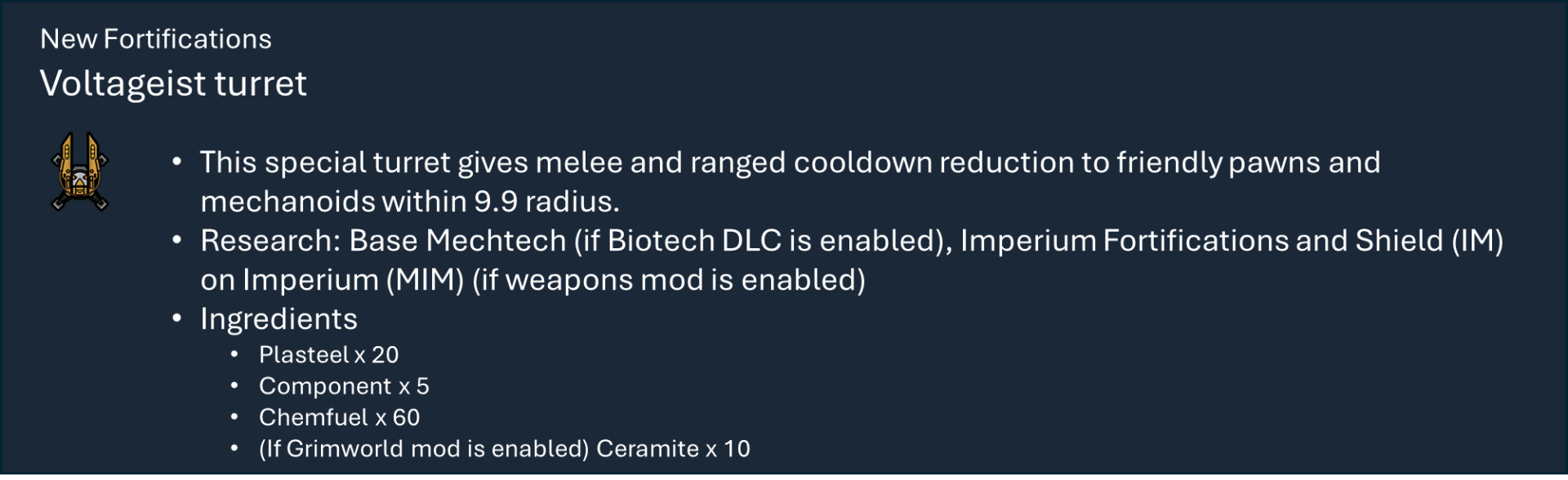 Чтобы правильно использовать мой набор модов, вам необходимо оформить подписку на этот мод, мод на оружие и, по крайней мере, на один из основных модов фракций, а также хотя бы на один из их подфракционных модов. Мод на оружие дает вам 40 тысяч тематических видов оружия с исследованиями и несколькими рабочими местами (только для генокрадов и некронов). Фракция Imperium использует обычный верстак или верстаки из других модов WH, если они включены.), мод Faction core содержит специальные способности и конфигурации для каждой фракции, мод Sub faction предоставляет вам одежду, специальный механизм, фракции NPC и начальный сценарий.
