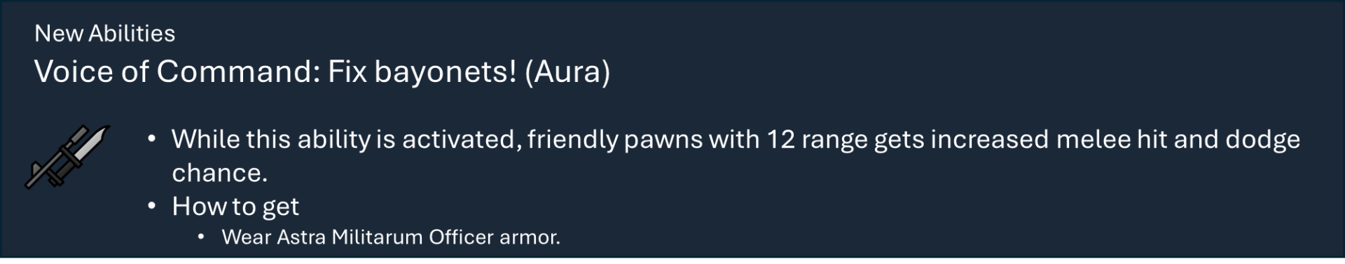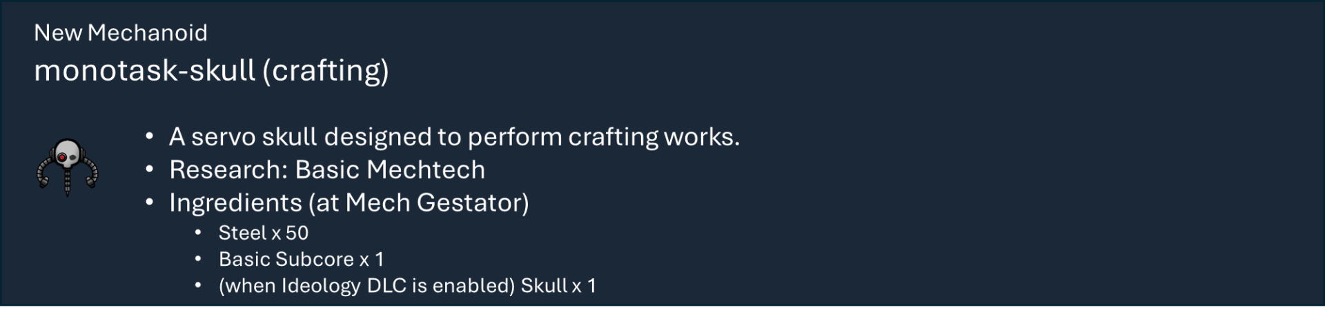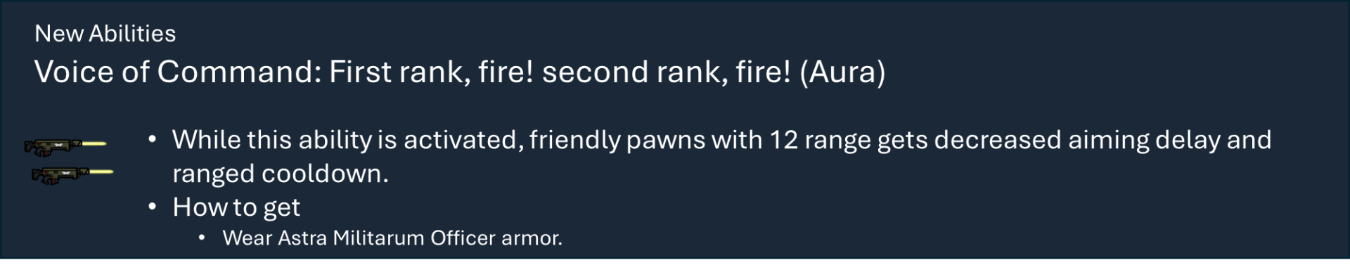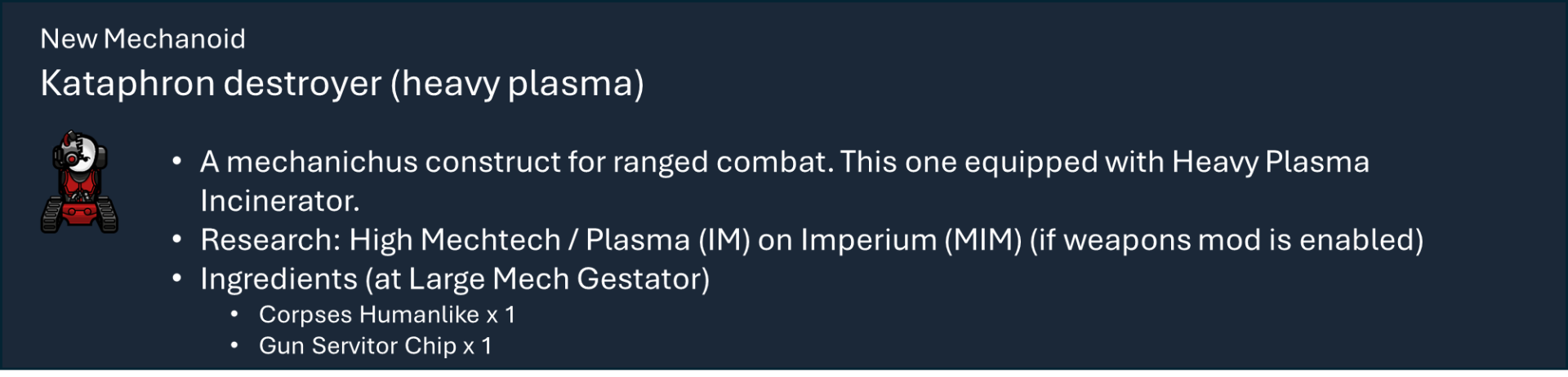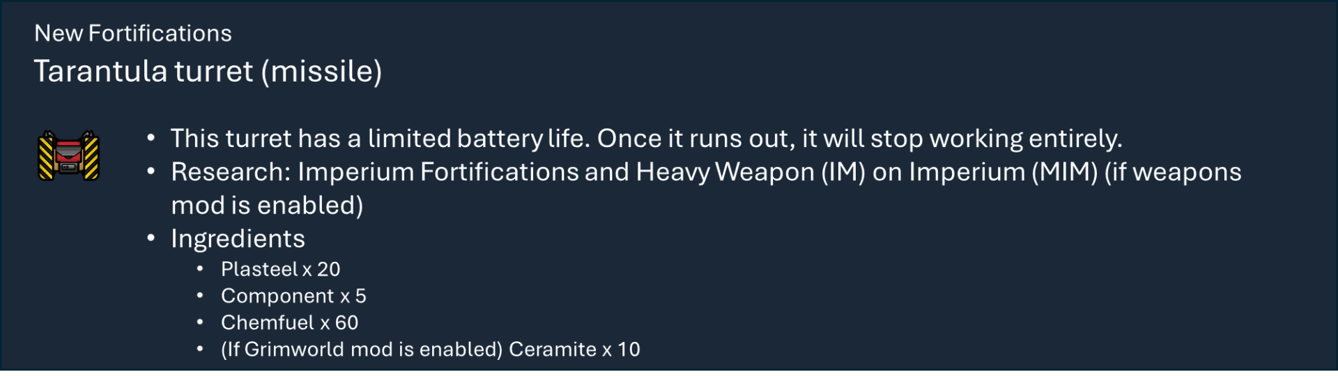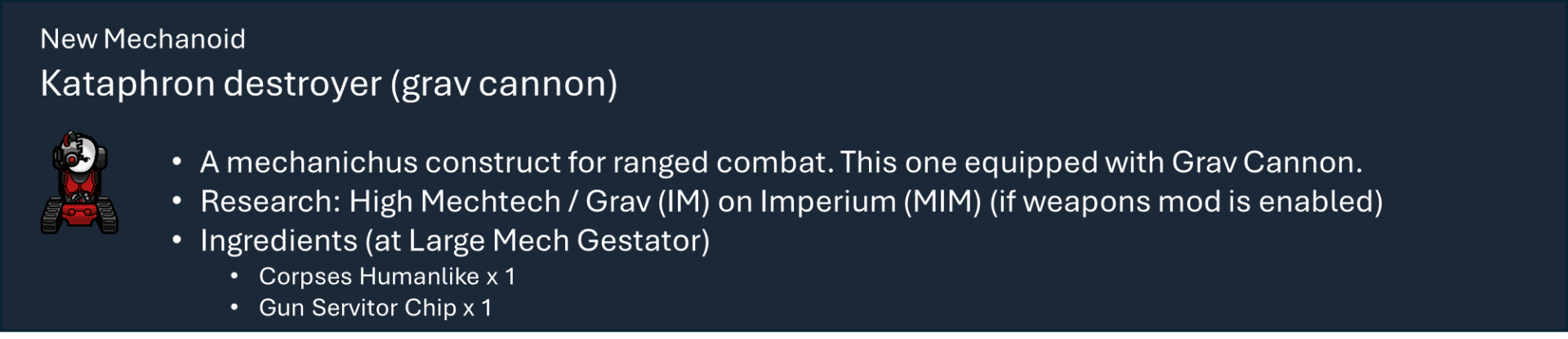 Чтобы правильно использовать мой набор модов, вам необходимо оформить подписку на этот мод, мод на оружие и, по крайней мере, на один из основных модов фракций, а также хотя бы на один из их подфракционных модов. Мод на оружие дает вам 40 тысяч тематических видов оружия с исследованиями и несколькими рабочими местами (только для генокрадов и некронов). Фракция Imperium использует обычный верстак или верстаки из других модов WH, если они включены.), мод Faction core содержит специальные способности и конфигурации для каждой фракции, мод Sub faction предоставляет вам одежду, специальный механизм, фракции NPC и начальный сценарий.